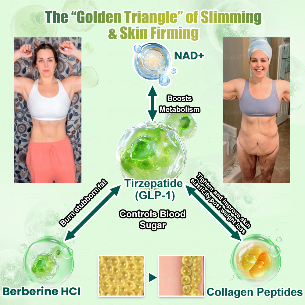 Collagen peptides strengthen skin structure, reduce fine lines, and improve elasticity. NAD+/NMN promote cellular repair and collagen synthesis, while Omega-3 helps lock in moisture and enhance smoothness. Green tea extract, turmeric, and moringa leaf extract are rich in powerful antioxidants and anti-inflammatory compounds that protect the skin from oxidative stress and environmental damage, helping slow down the aging process. Magnesium supports skin repair and hydration balance, while silymarin provides detoxifying effects to brighten the complexion. This synergistic formula effectively improves sagging skin, smooths wrinkles, delivers anti-aging benefits, and restores firmness and a youthful appearance after weight loss.